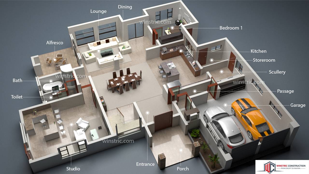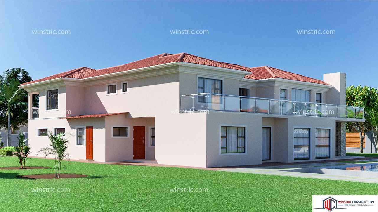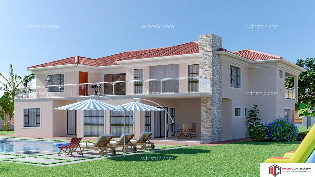Classic 4-bedroom double storey house plan with a double garage. On the other side the house it has a sound proofed studio that has a bar on the other corner. A small patio is also provided from the living area exit for relaxing with a fire place.