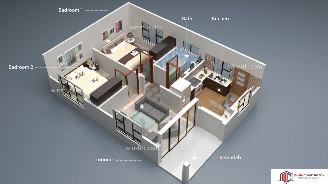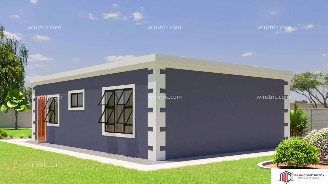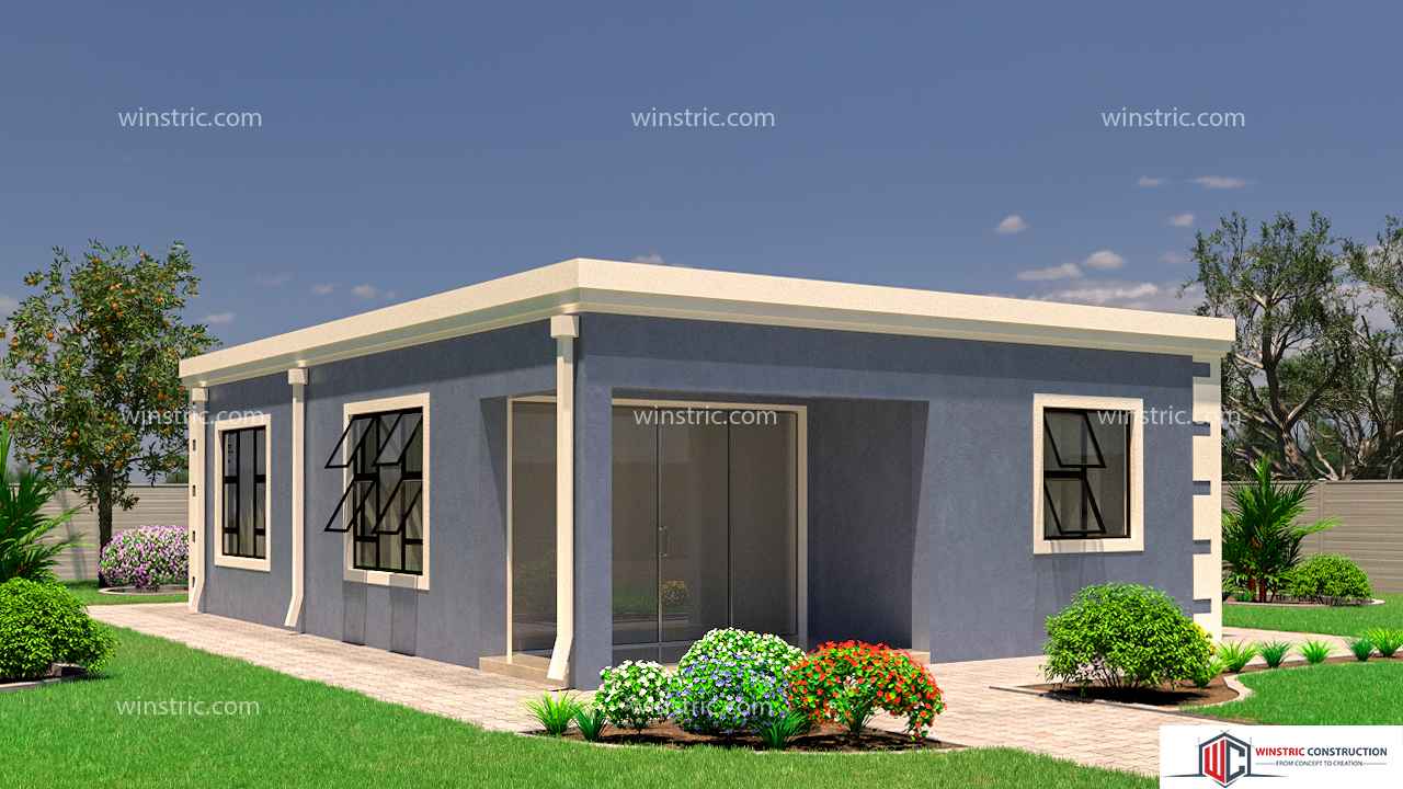 A parapet wall on all sides of the house conceals the roofing sheets giving it a sleek look with straight clean lines adding to the modern style of the design. The 2 bedroom house plan s flex for a small family.