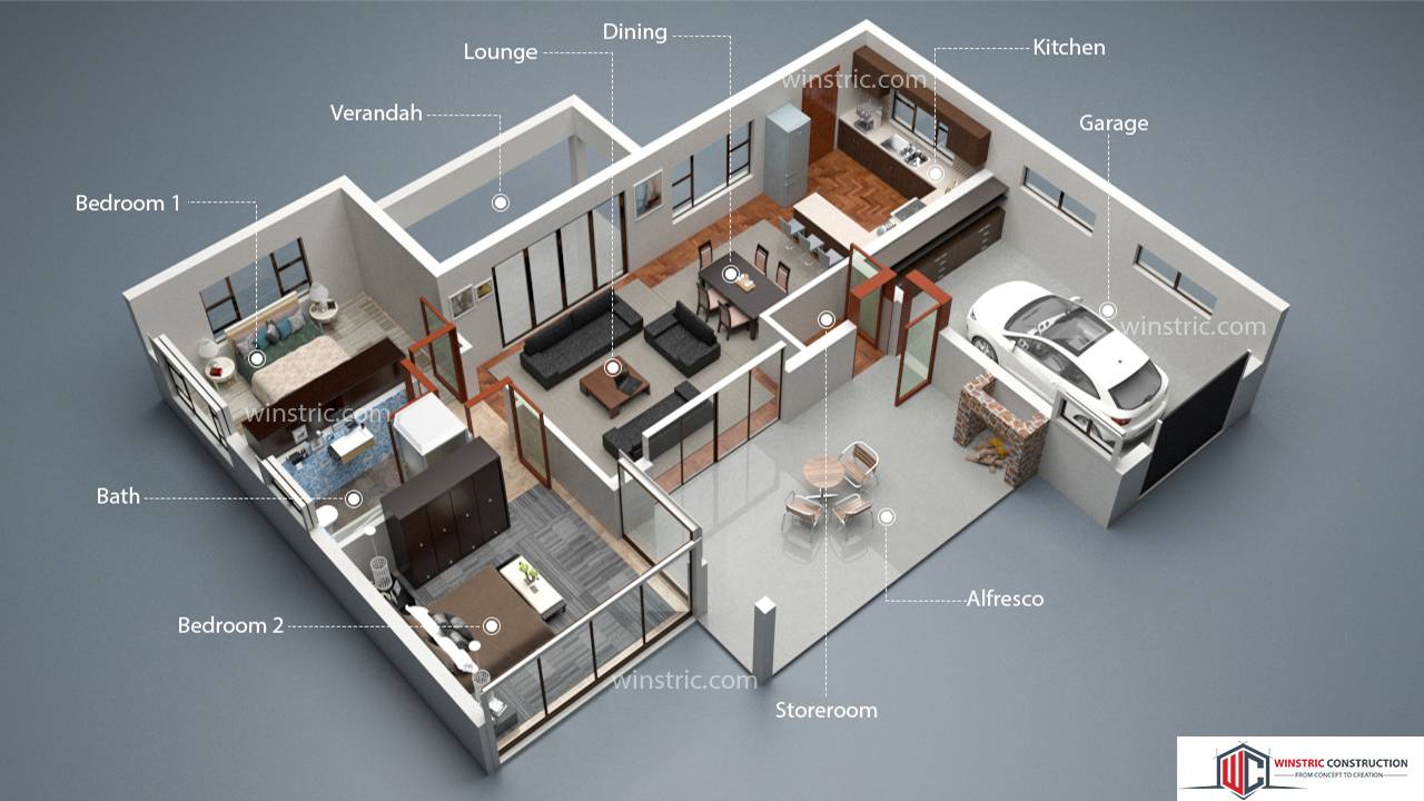 Modern design of a 2-bedroom, open plan and a single garage. It has an alfresco that has a built-in braai stand, perfect for a weekend barbecues when you make use of the outdoor use. A master bedroom has a wide window to allow enough natural light.
