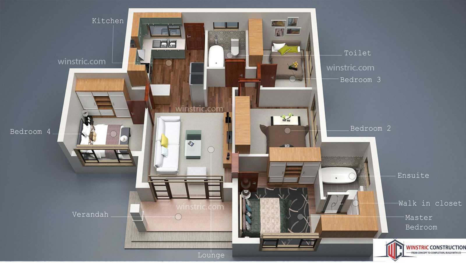 A beautiful designed 4-bedroom house plan with a modern layout. With a front verandah you have a welcoming entrance leading you directly into the living room. All bedrooms have built in cupboards and the master bedroom has a walk-in closet.