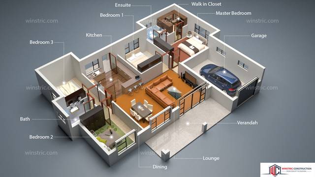 A simple 4 bedroomed house plan with an open plan and a single garage. A big verandah that can accommodate an alfresco.