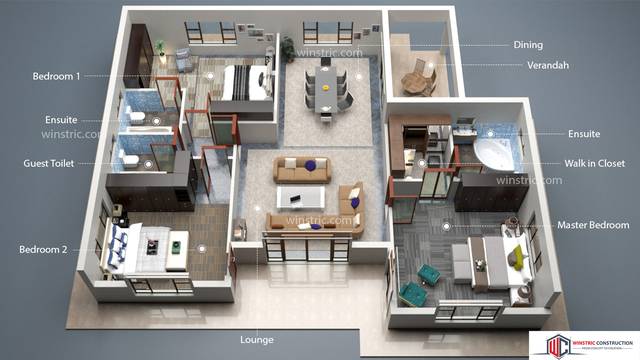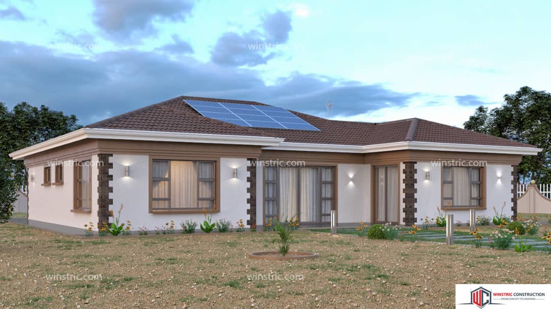 A spacious 3 bedroom house design for rural areas. It has 2 bedrooms with ensuite and one without yet all bedrooms have big building cupboards.