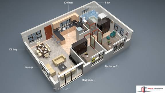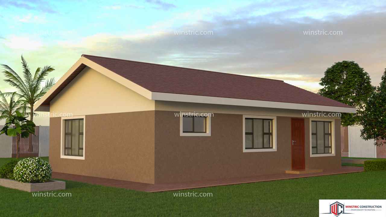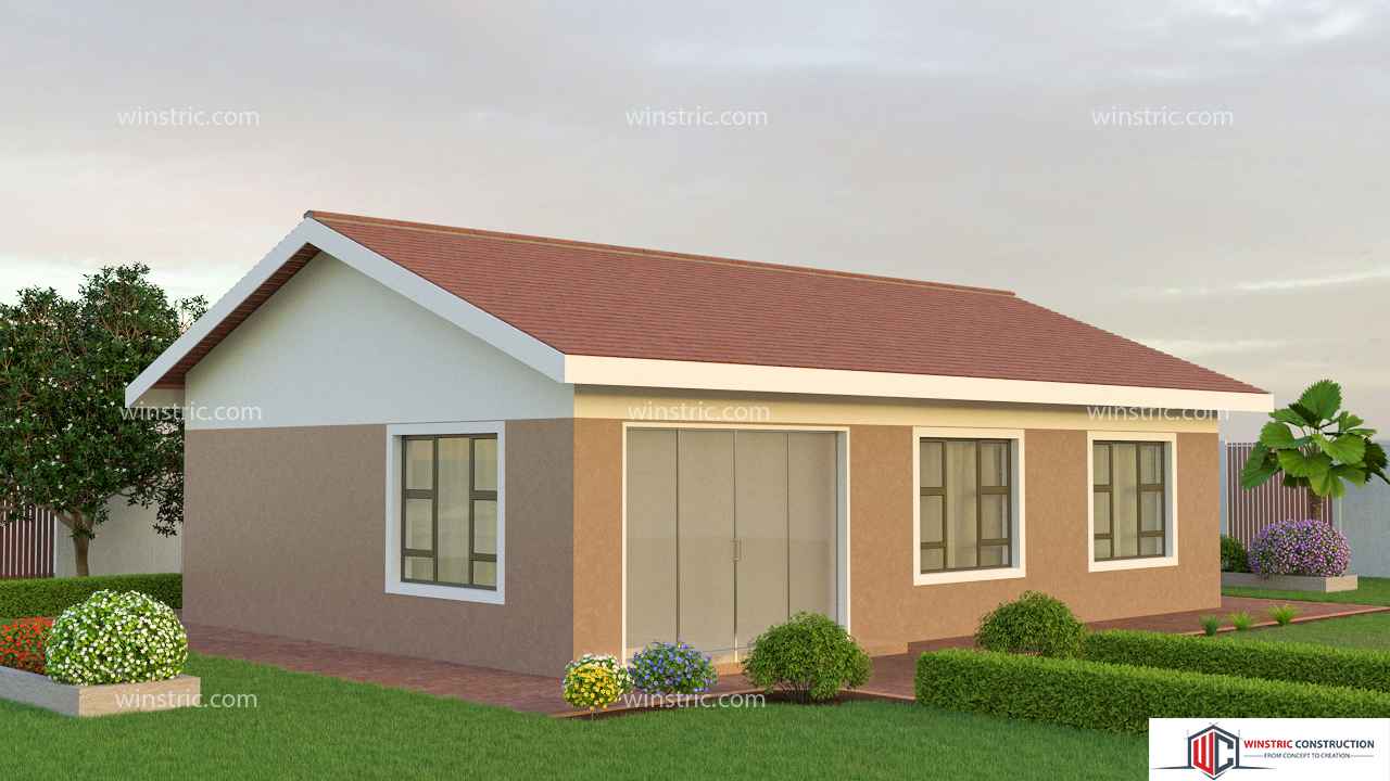 A simple design of a 2-bedroom house plan with open-concept ideal for a small family. Lounge, dining room and kitchen in an L-shape layout. A short passage, you'll find a full bathroom with bathtub.