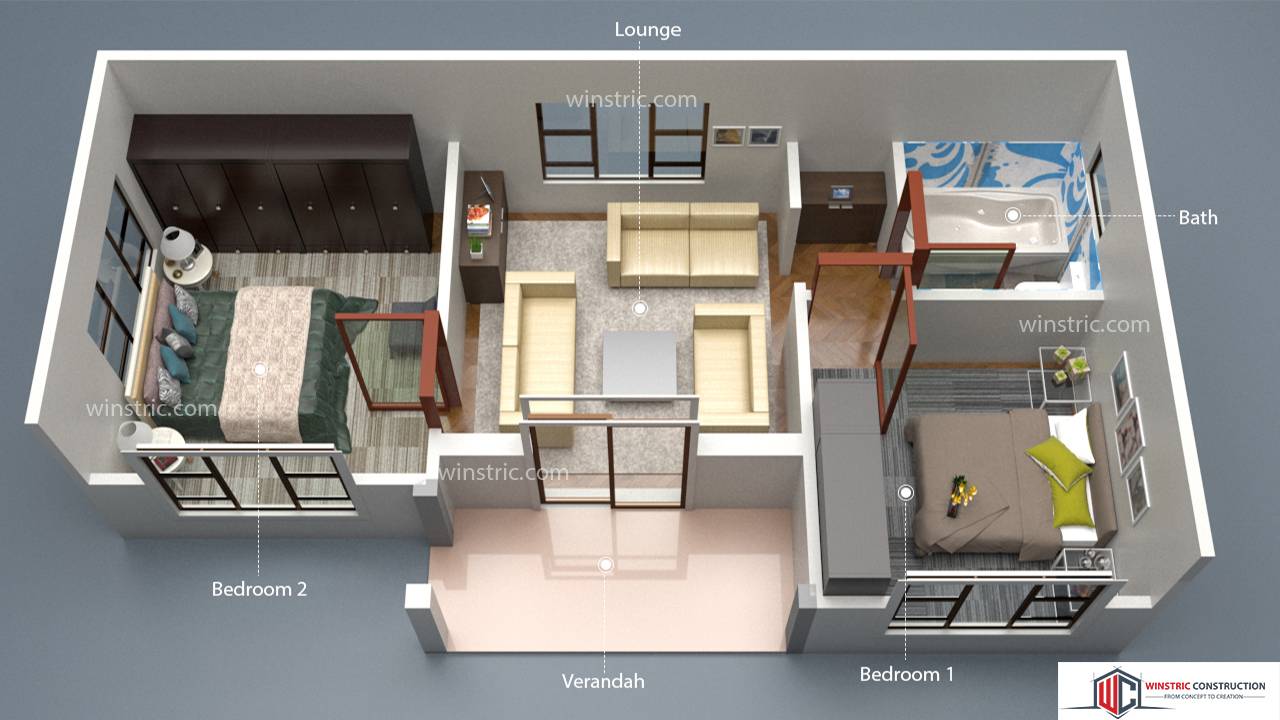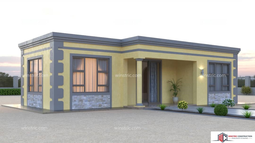 A 2 bedroom cottage ideal for servants’ quotes or rural areas. It has only big lounge in the middle of 2 bedrooms. The roof design is very economic although it’s a little bit ancient.