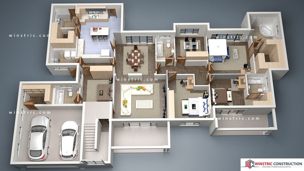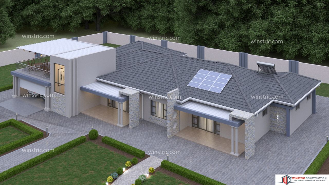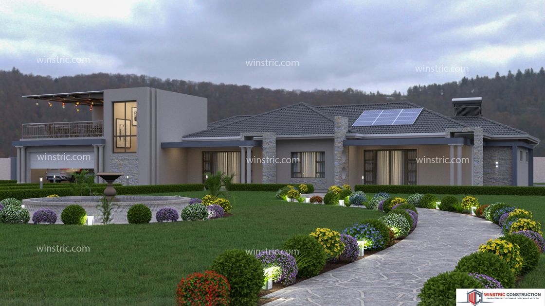 Modern Home with a sleek, single-story residence, mixed stone and smooth finishes, large windows, and an inviting elevated outdoor seating area. Has spacious room and open plan. With capacity to accommodate a big family and office.